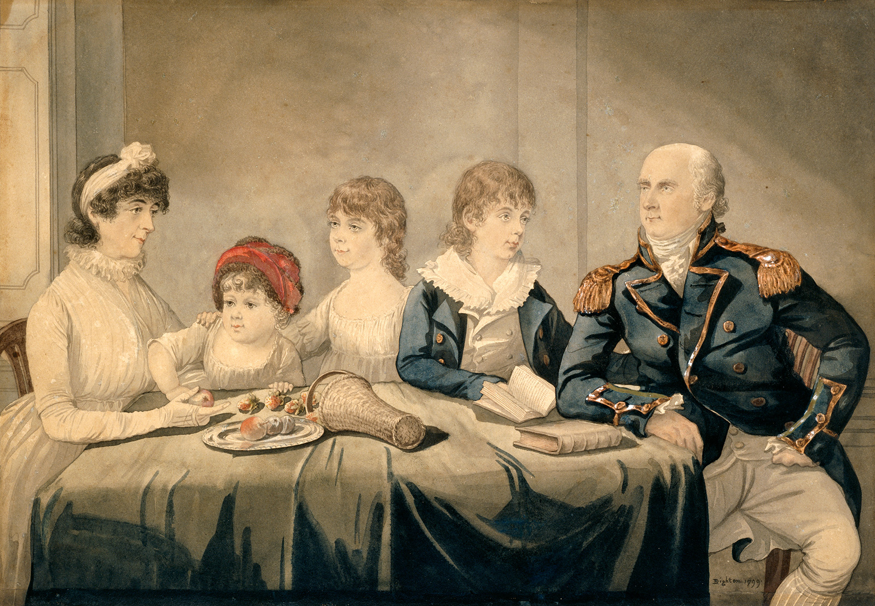 Philip Gidley King (1758-1808), his wife Anna Josepha (1765-1844) and daughter Elizabeth (1797-1856), then their youngest child, left England for NSW in 1799. Captain P.G. King had received his post-captain’s commission on 5/12/1798, and was appointed third Governor of NSW (1800-1806). The King family were not reunited with their two elder children, Anna Maria (1793-1852) and Phillip Parker (1791-1856), until 1807. It seems to have been common practice for officers departing for overseas service to have a portrait made, though family portraits like this one are less common. Robert Dighton (c.1752-1814) was an English portrait painter, printmaker and caricaturist who was regularly commissioned to paint portraits for military families.