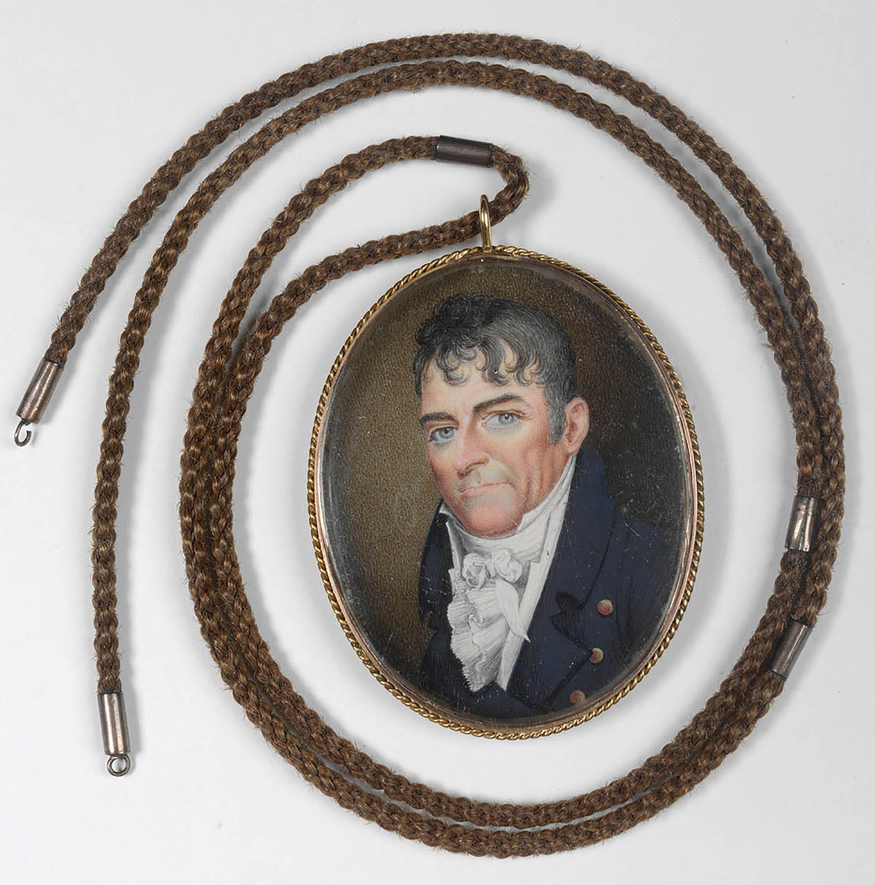 This left facing 3/4 profile portrait miniature shows Eber Bunker at about 57 years of age. He is elegantly portrayed in a dark blue, double-breasted woollen jacket with double-notched lapels and brass buttons, worn over a white waistcoat and linen shirt, with a stand collar and finely pleated, ruffled front, a white stock wrapped around the throat, tied in a small bow at the neck. Bunker is clean shaven; his dark grey hair has been left in long curls on top, cropped close around the sides, and brushed forward at the front, with a curled fringe arranged across his brow.