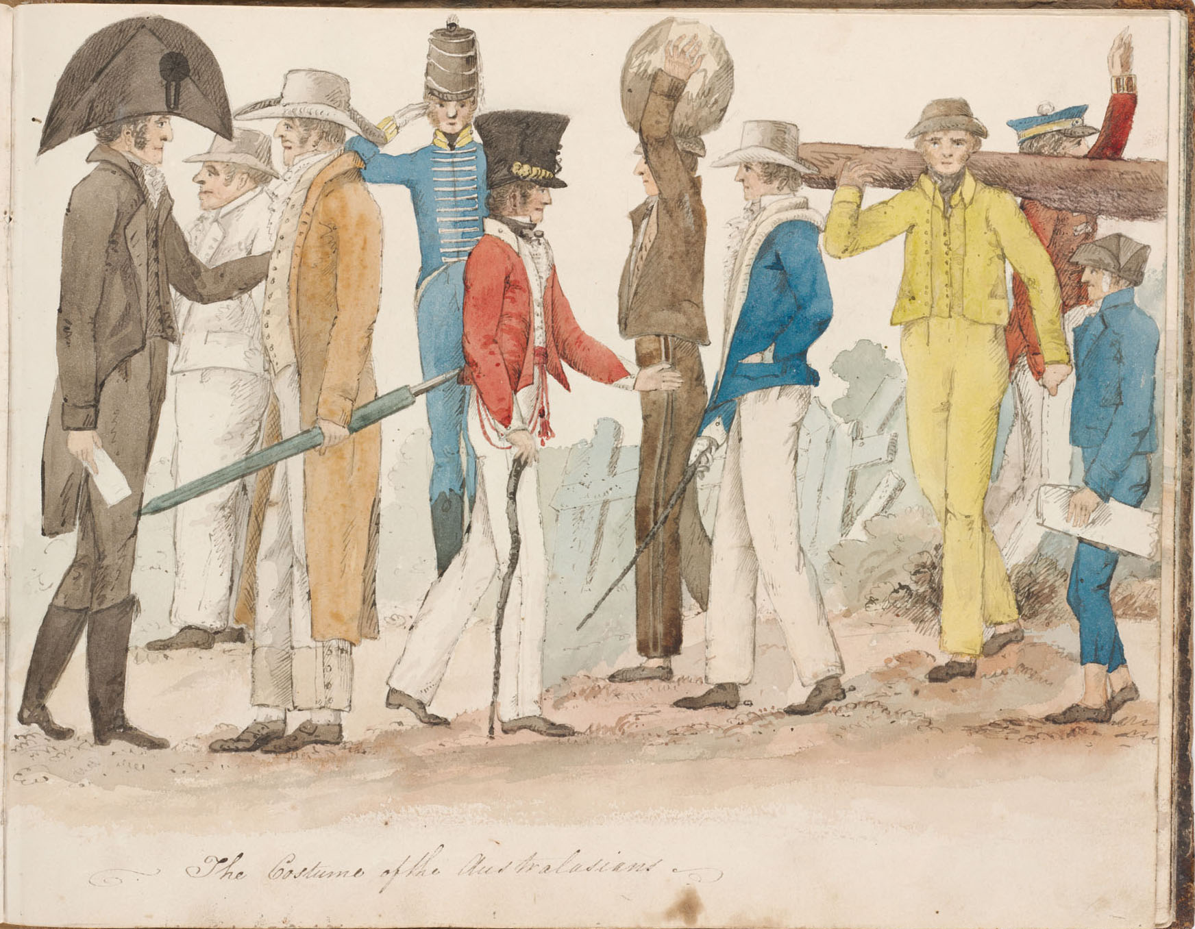 This drawing is a primary source for the history of clothing in Australia. Distinctive in its social inclusiveness, and its tone of amiable satire, it includes rare images of convicts and provides a splendid record of how class and status in a penal colony were instantly recognisable by dress.