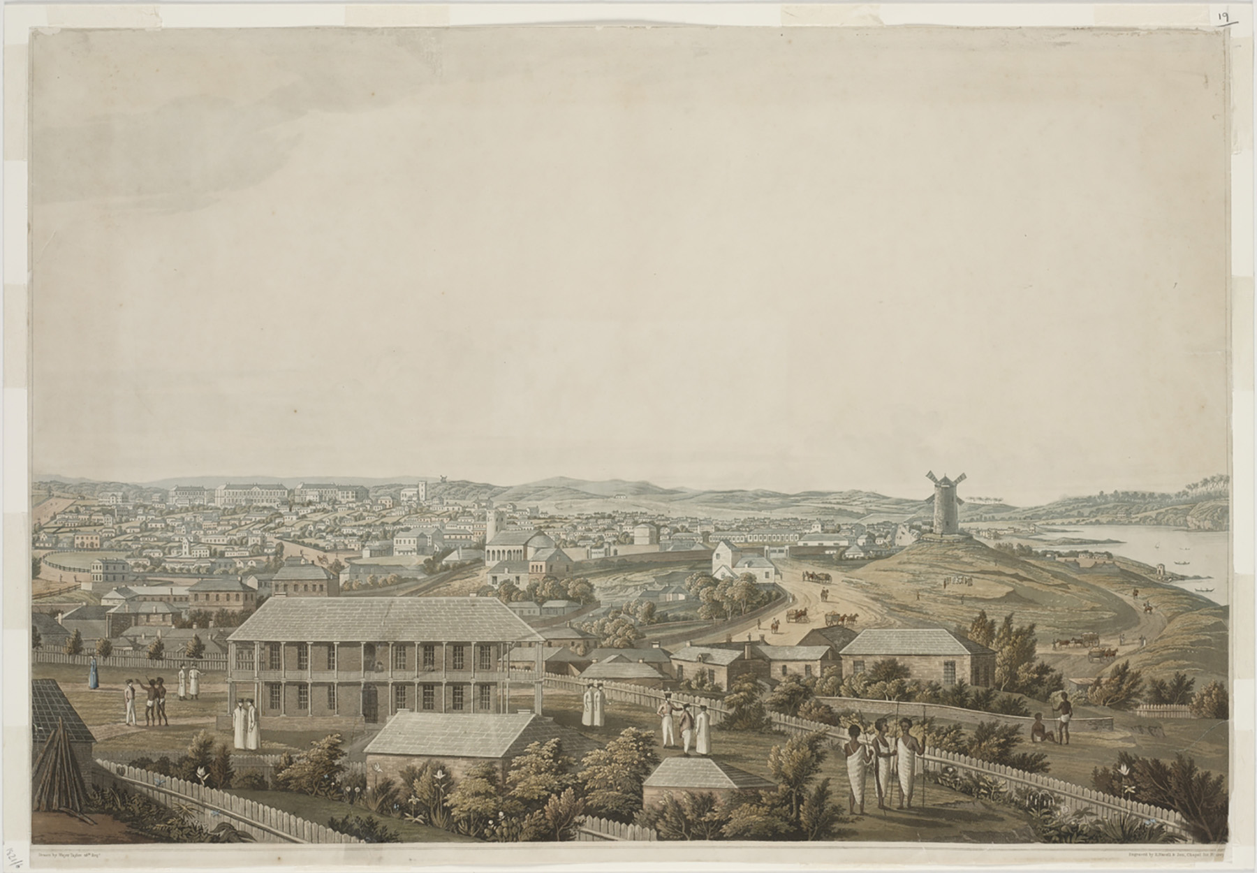 This plate is part of triptych (three-part set) of views which, when joined together form a panoramic landscape view taken from the vantage point of Observatory Hill in Sydney. This section of the panorama looks north across ‘the magnificent Harbour of Port Jackson – its rocky and picturesque Shores – its numerous Islands and inlets – the Town of Sydney – the beautiful and Romantic Scenery of the Vicinity…’ (Prospectus for the prints) and includes the small convict cottages of The Rocks (in the middle ground) as well as larger civic establishments like Governor Macquarie’s grand new gothic mansion (on the far left) set in its private domain.
