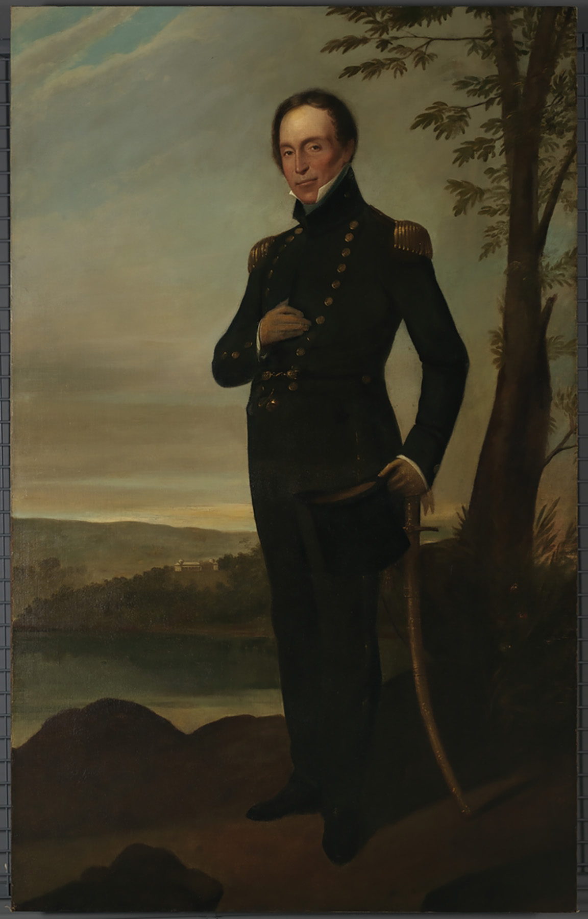 This life-size, left-facing, full-length, standing ¾ profile portrait depicts the 53-year-old Captain John Piper in a commanding pose. Its landscape setting is immediately identifiable as the eastern foreshore of Sydney Harbour, with a distant view to Henrietta Villa, Piper’s recently-completed prestigious waterfront home at Point Piper, forming an appropriate backdrop.