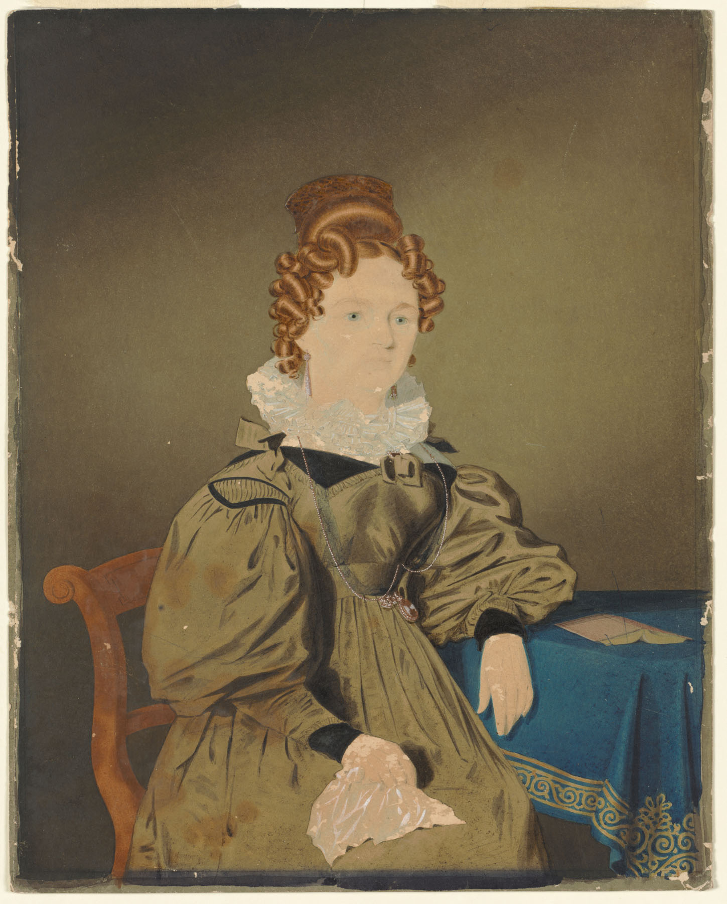 This right facing, ¾ length, portrait shows a young woman posed in a domestic setting seated on a tablet-backed [cedar] side chair with scroll supports (probably of colonial manufacture), holding a handkerchief in her right hand on her lap, her left arm resting next to an open book laid face down on a square-cornered table with a blue [felt] cover decoratively bordered with braid.