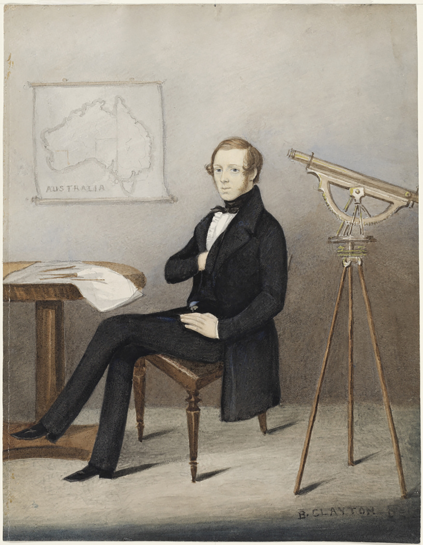 This left facing, full-length seated portrait depicts an unidentified surveyor, his profession implied by the theodolite, or surveyor’s level, positioned on the left. The subject is possibly Captain Charles Sturt, aged in his early 40s at the time the image was created. He is posed seated on a [cedar] side chair next to a small, round-topped table with a quatreform base and cylindrical ‘gun-barrel’ column in the style of the late 1830s-early 1840s, on which are laid a map, a pencil and a compass. The map on the wall shows the recently established colonies at Swan River, WA (after 1830) and Adelaide, SA (as proclaimed in 1834), and the eastern Australian colonies as yet unseparated.