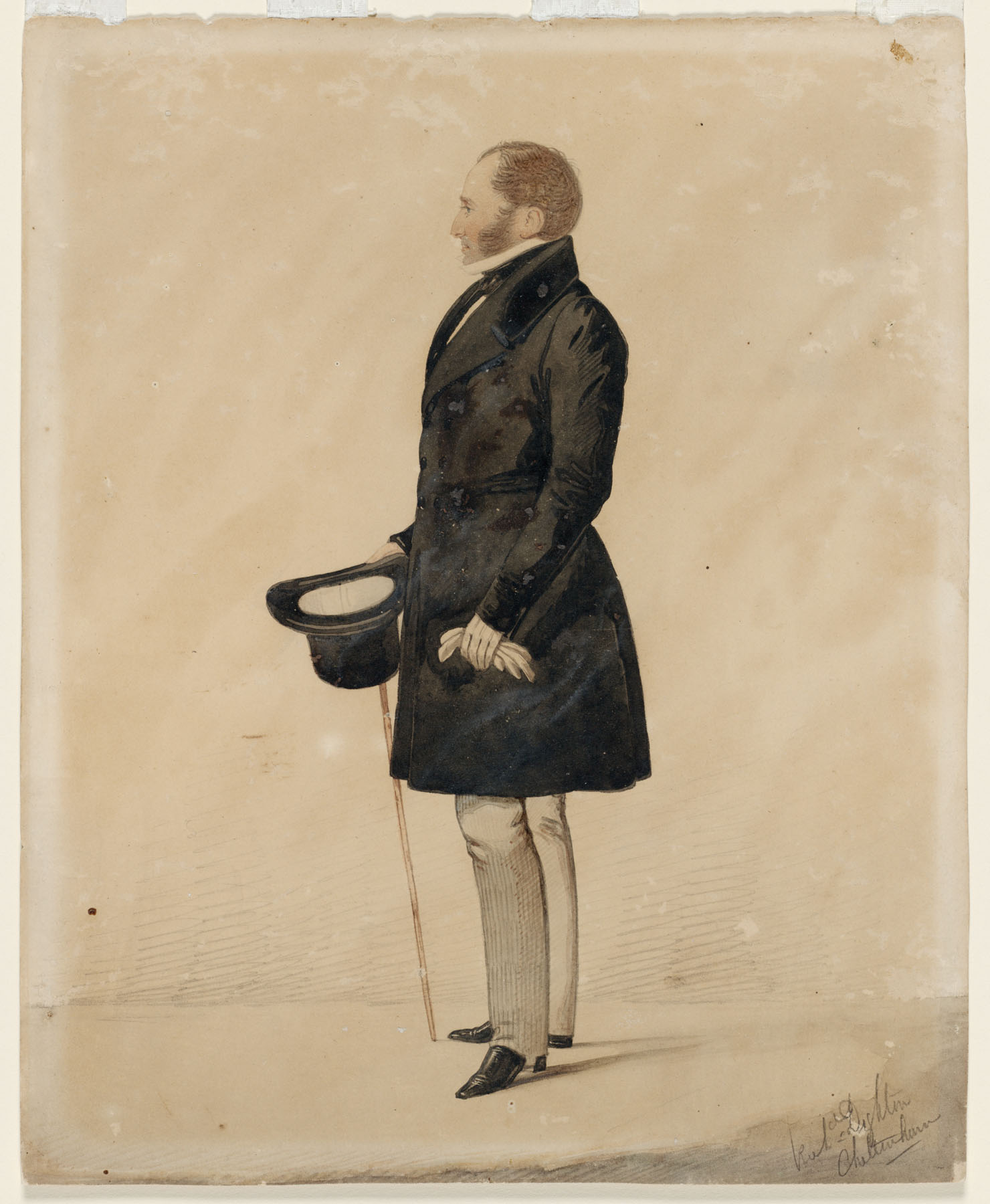 This left facing, full length standing profile portrait shows Edward Gostwyck Cory, aged 40, in street attire. It was painted in England, during Cory’s five years residency there between 1837 and 1842.
