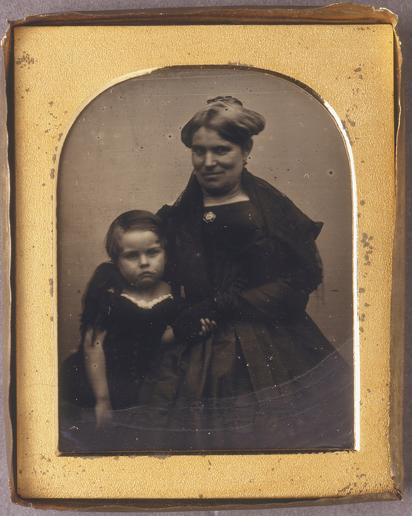 This ¾ length daguerreotype portrait shows Caroline Lawson, aged 43, smiling somewhat uncertainly into the camera as she stands with her right arm wrapped around the shoulders of her youngest son, Thomas James, aged 3½, holding him close by her side to minimise movement and subsequent blurring of the image during its lengthy exposure.