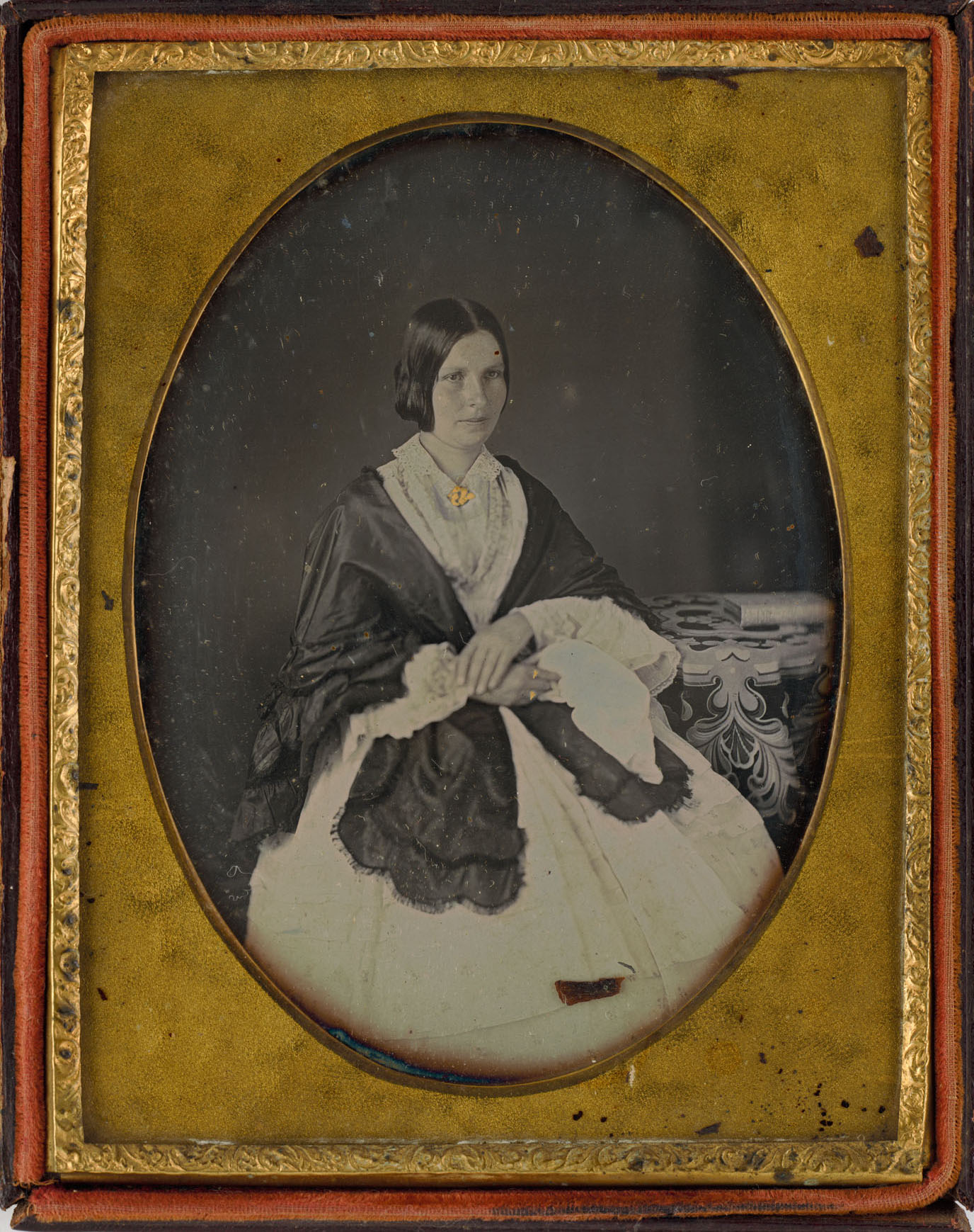 She wears a dark-coloured shawl of light-weight silk draped around her shoulders, folded in half to create a doubled triangle with two rows of scalloping trimmed with fine lace, the lower edge forming a border, and held demurely in place by her crossed arms. Daguerreotypes, being positive mirror images, are laterally reversed – which means wedding rings customarily worn on the left hand (as seen in this image) will appear to the viewer to be worn on the sitter’s right hand.