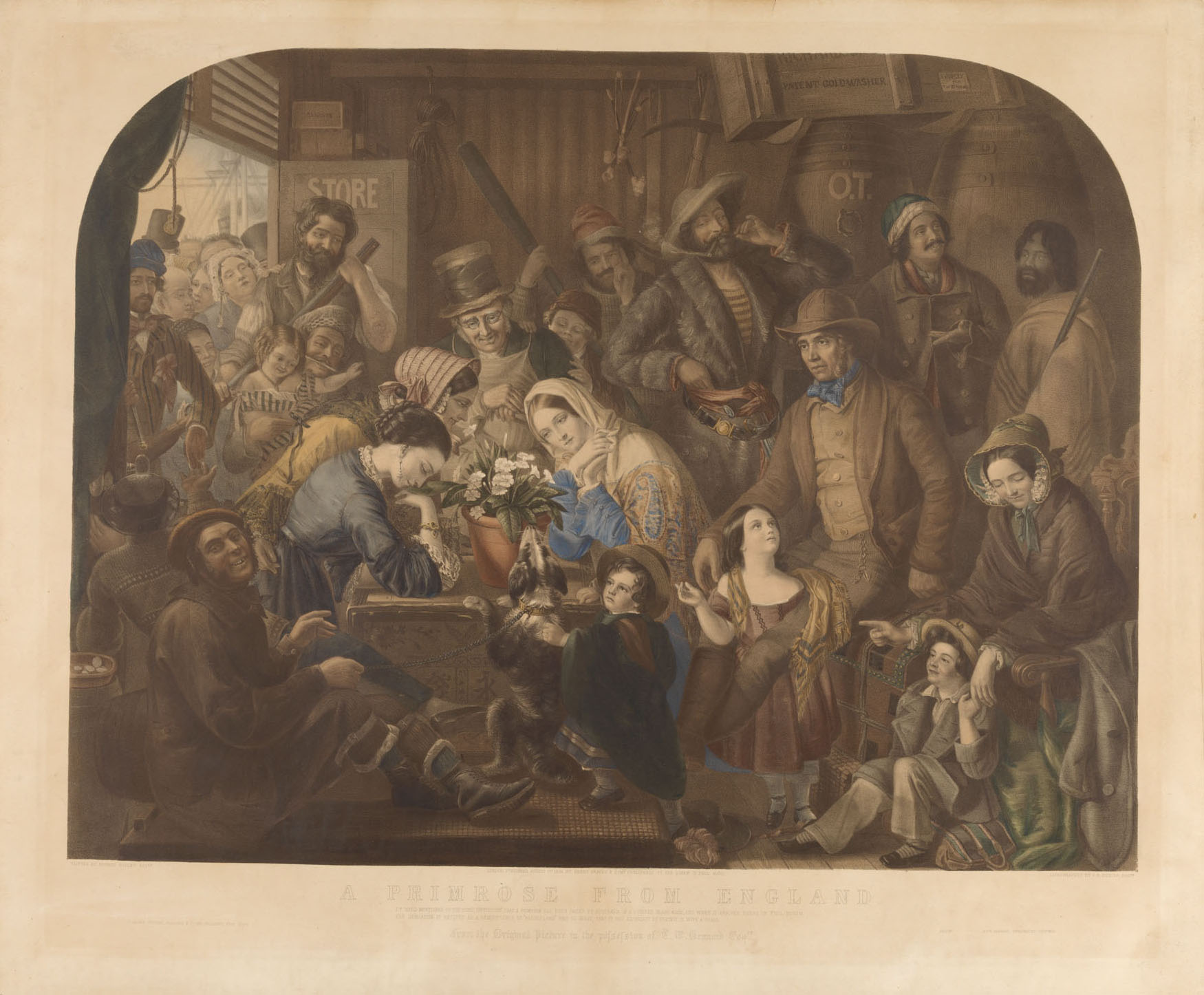Though the original painting was created in England, the artist has been careful to craft an image that offers a richly layered narrative on the dual theme of immigration and colonization, using his subject as a vehicle for exploring the emotions associated with the nineteenth century emigrant experience. He portays a diverse and multi-racial, cross-section of migrants, each stereotypical of his or her class or station in life, gathered round the Primrose, with individuals from different social strata intermingled in a potentially chaotic space, while others crowd the doorway anxious to gain access to the colony’s latest European import.