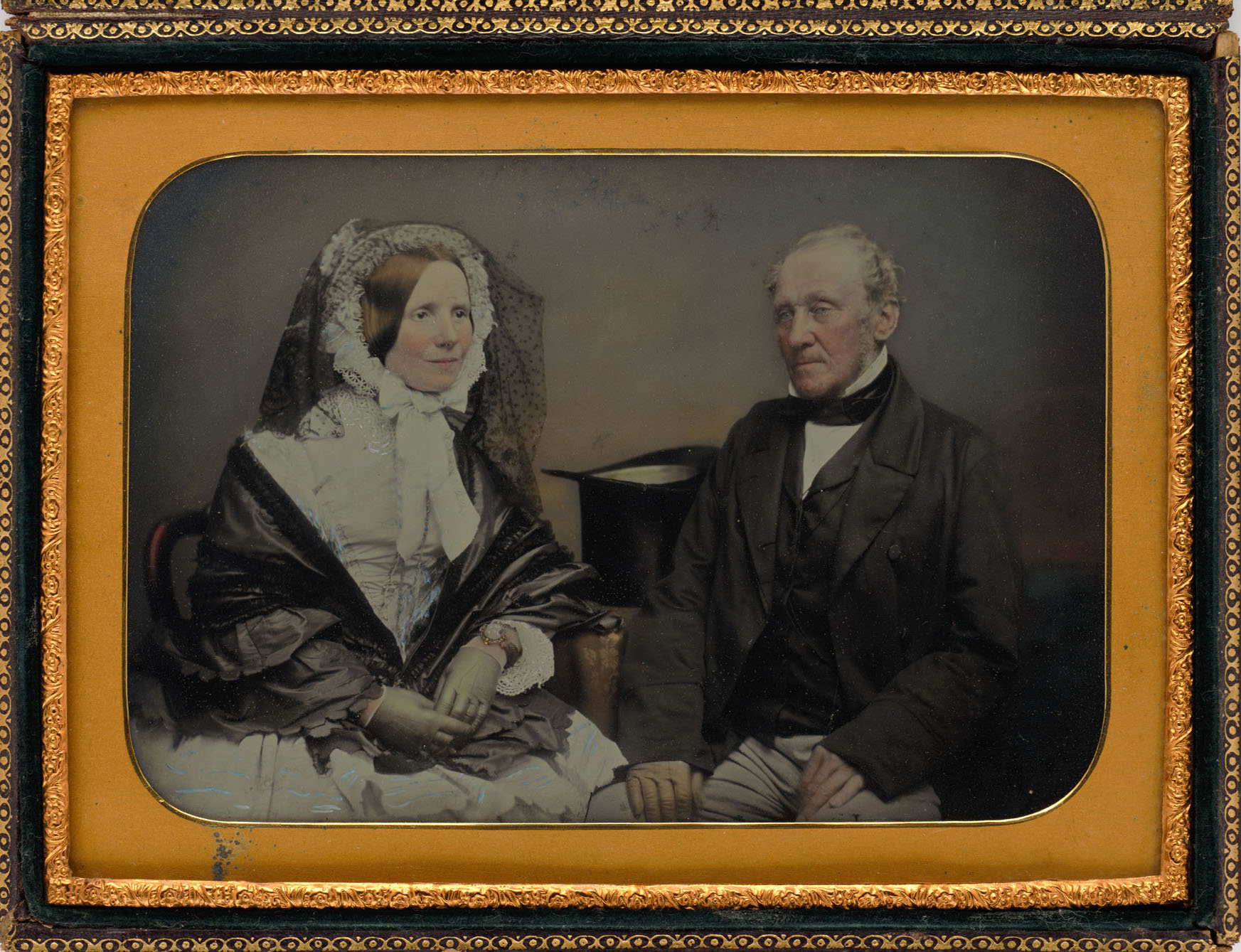 This ½ length seated double portrait is a rare record of a prosperous colonial couple, smartly and expensively attired in fashionable outwear suitable for paying formal afternoon calls. It is believed to show Mr and Mrs Francis Rawdon Hume. The sitters in this image face towards each other, a conventional pose for married couples. They appear to be aged around 50 and 40 years, conforming to the known age difference of about 12 years between Mr and Mrs Hume, which would seem to support this attribution.