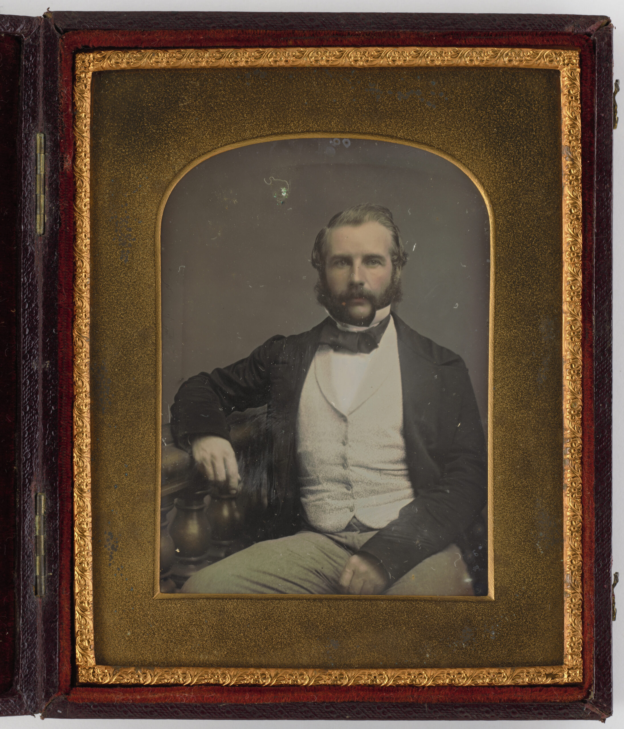 This front facing ¾ length hand-coloured daguerreotype portrait shows surveyor John Frederick Mann, aged 38, in a seated pose with one arm resting on a section of turned wooden balustrading, set against a plain backdrop. Though the sitter wears no wedding band, it probably dates from around the time of his marriage in April 1857. It was taken at the Sydney studio of Freeman Bros (William and James) – the Gallery of Photographic Art – located at 231 George Street.