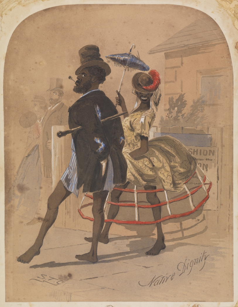 The Indigenous woman portrayed in this image wears that most ubiquitous of mid-century 19th century fashion accessories, the ‘cage crinoline’. Invented in the mid-1850s, this light-weight steel support allowed European women to dispense with layers of heavy petticoats, freeing their limbs for walking. Being cheap and easy to manufacture, it was one of the first fashions to be almost universally adopted though, if not managed properly, it could also be a source of embarrassment – bobbing up and down unless short steps were taken and swinging wildly on windy days – which inspired more jokes than any other women’s fashion accessory up to the time.