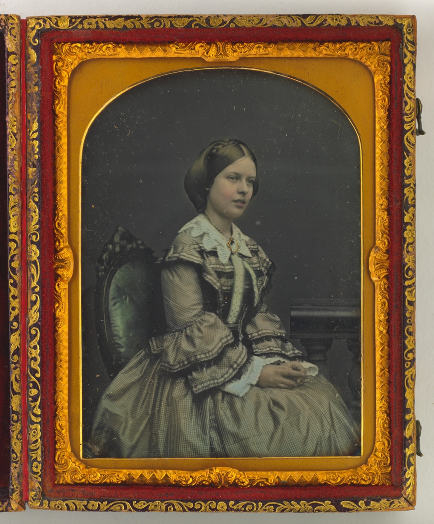 This delicately hand-tinted ambrotype portrait is highly unusual as the date and location of the photograph can be confirmed by the presence of a copy of the 1857 Sydney Post Office Directory, quite deliberately positioned to ensure its legibility, in the lap of the woman seated on the left identified as Amelia Dorcas Ormod, nee Troughton. For their front facing ¾ length group portrait the three female members of the Troughton family (thought to be sisters) wear very similar styles of day dress, with jacket-style bodices and full skirts. All the dresses have sloping shoulder lines and three-quarter length pagoda sleeves, trimmed at the elbow with ruched or fringed oversleeves and worn with ruffled and flared white undersleeves, with loose pleats (which may or may not conceal centre front fastenings) fanning up the corsage from the waist and spreading over the shoulders. Amelia, aged 22, wears the plainest gown with a white peter-pan style collar and a ribbon tie, and two rows of braid trimming the edges of her sleeves. Her sisters, [Mary] and Clara, standing to the right, wear dresses of light-coloured checked cotton and dark silk taffeta respectively, both with shirred panels at the waist, Clara’s silk gown with matching silk fringed trim on the edges of the sleeves. All three women wear their hair in the popular bandeau style of the mid-1850s, for which smooth front sections of hair have been wrapped over the ears and drawn back to the nape of the neck, the remainder arranged behind in a longer and deeper roll; the sheen of their hair suggests that it has probably been oiled. Perhaps to accommodate the tightness of the pose, their unornamented dome-shaped skirts are somewhat lacking in fullness, despite being finely ‘gauged’ (ie. cartridge pleated) at the waist, and would appear to be worn without the customary 4 or 5 layers of crinoline (ie. horsehair) petticoats necessary – before the advent of the sprung-steel cage crinoline in 1856 – to achieve the fashionable 1850s silhouette.